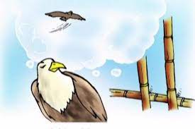 Những con gà quanh đó đều đồng thanh cười tán thưởng :”Đúng đó, hắn là tồ nhất làng”. Nói rồi một con gà khác nhảy lên cổ hắn đè xuống như để chứng minh cho điều mà mọi người khẳng định. Đến lúc này, vị khách kia mới lấy lại chút bình tĩnh và rồi cũng rụt rè rời khỏi chỗ ẩn nấp. Cư dân thấy vậy liền kéo hắn ra, vừa kéo vừa động viên: – Có gì đâu mà sợ, anh cứ ra đây nhìn hắn xem, hắn là con gà tồ nhất làng này đấy. Ra đến nơi, ông khách lạ kia vẫn chưa hết nghi hoặc, nhưng được dân làng trấn tĩnh nên cũng không còn bỏ chạy như trước nữa. Lúc đó, anh chàng cao lớn vẫn bị dân làng gọi tếu là “gà tồ” cũng bước đến thăm hỏi một cách khá ngượng ngùng. Đến lúc này, tuy vẫn còn sợ hãi, nhưng ông khách gà sao kia cũng lấy được bình tĩnh để tiếp chuyện anh bạn cao lớn vừa đến chào hỏi mình. Nhìn kỹ lại gà sao vẫn thấy rằng đây đích xác là đại bàng chứ không thể là “gà tồ” được. Nhưng thực tế trước mắt anh thì hành vi của chú đại bàng này lại chả khác gì một con gà chính hiệu. Tin rằng đã có sự lạ, vị khách kia bèn xin ở lại ngôi làng gà một thời gian để điều tra nguồn gốc của anh chàng “gà tồ” kia. Cư dân làng gà vốn thân thiện, lại chưa bao giờ có người lạ đến thăm nên cũng rất niềm nở chào đón. Những ngày sau đó, ông khách gà sao kia lân la hỏi chuyện, thì biết rằng anh bạn “gà tồ” kia không phải kẻ lạc đường như mình. Hắn đã có mặt ở ngôi làng này từ khi còn là quả trứng, và cũng được ấp nở, lớn lên như mọi cư dân khác, gà sao lờ mờ hiểu được câu chuyện. Gà sao mang thế giới bên ngoài làm câu chuyện kể với cư dân trong làng, mọi thứ của thế giới bên ngoài đều được hắn kể lại cho dân làng nghe. Với cư dân làng gà bao đời nay sống biệt lập, họ không biết chút gì về thế giới bên ngoài khu rừng. Gà sao hào hứng kể về đủ thứ bên ngoài khi thì hắn kể về Chúa tể rừng xanh, khi thì kể về các loài kẻ thù của họ gà như diều hâu, chim ưng, và… đại bàng. Cái tên mà hắn đã từng nhắc đến với sự sợ hãi tột cùng trong lần đầu gặp “gà tồ” của làng. Theo lời kể của hắn, đại bàng là chúa tể của bầu trời, là vua của các loài biết bay. Dân làng thấy vậy thì càng tò mò, giục vị khác kia miêu tả về vị chúa tể bầu trời đó. Kỳ lạ rằng những gì mà gà sao kể về hình dáng bên ngoài của vị chúa tể đại bàng cứ như thể đang nhìn vào “gà tồ” mà tả vậy. Dân làng cảm thấy kỳ lạ một, thì với “gà tồ” hắn còn hồi hộp gấp trăm lần. Vì bao lâu nay hắn vẫn luôn nghi ngờ về nguồn gốc của mình. Gà sao cũng lý giải cho dân làng về sự khác lạ của “gà tồ”, việc sải cánh của hắn vốn dùng để bay lượn trên không trung lại trở thành vướng víu với cuộc sống dưới mặt đất, cặp chân đầy móng sắc của hắn hiệu quả khi săn mồi bao nhiêu thì lại trở nên vụng về bấy nhiêu khi bới đất tìm giun, vì thấy hắn vụng về, ngờ nghệch như vậy nên cư dân mới đặt biệt danh cho hắn là “gà tồ”. Dần dần, “gà tồ” cũng tin rằng hắn đích thị là đại bàng, và như thế khao khát bầu trời của hắn bấy lâu nay giờ đã có thể thực hiện. Trước đây, hắn vẫn luôn cảm nhận rằng hắn thuộc về bầu trời xanh bao la, và ao ước cháy bỏng được dang cánh bay lượn trên không trung. Với niềm tin rằng mình chính là đại bàng, nên hắn ra sức luyện tập bay, hắn ra sức nhờ ông khách lạ kia chỉ dạy hắn cách bay, và cũng được chỉ dạy rất nhiệt tình. Tuy vậy, bao nhiêu năm lớn lên, hắn có bao giờ tập dang cánh đạp gió đâu, hắn đã quen với việc chạy bộ trên đất từ khi mới nở rồi. Dù rằng được chỉ dạy bởi một kẻ biết bay, và tập luyện cả năm trời, nhưng “gà tồ” cũng chỉ có thể bay lượn ở tầm thấp, quanh quẩn trong khu rừng rậm, không thể nào bay lên tận mây xanh được. Hắn biết rằng hắn đã bỏ lỡ cơ hội đó rồi, dù có là đại bàng đi nữa, mà không tập bay từ khi còn nhỏ cũng sẽ không bao giờ có thể trở thành chúa tể bầu trời được. Cay đắng, ngậm ngùi, nhưng “gà tồ” kia cũng phải chấp nhận sự thật rằng hắn dù cố gắng đến mấy cũng chỉ là một chú đại bàng gà mà thôi, không thể nào trở thành đại bàng thực thụ được. Tuy vậy, ngẫm lại thì hắn vẫn có một đại gia đình hạnh phúc, một ngôi làng với những người bà con lối xóm thân thiện. Từ khi biết hắn là đại bàng, cư dân làng ban đầu cũng có vẻ sợ sệt, xa lánh “gà tồ”. Nhưng rồi họ nhanh chóng nhận ra rằng anh chàng cao lớn kia có là đại bàng đi nữa, hắn cùng chung sống và vẫn vô hại với dân làng, mọi người vẫn gọi đùa hắn là “gà tồ” và cũng đôi khi trêu hắn bằng cái tên mới: “đại bàng gà”. Hắn thấy với hắn khi này, cuộc sống bình yên như vậy là đủ rồi.